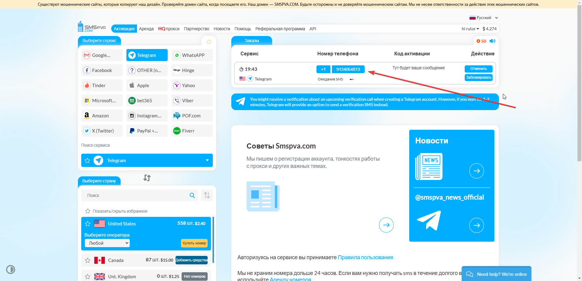 Далее идем на сайт сервиса который предоставит нам номер телефона для приема смс за биткоин !