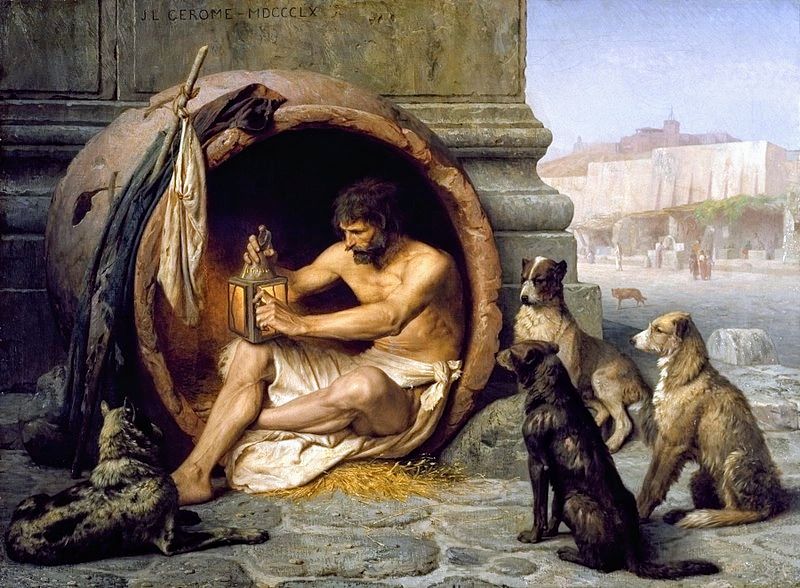 Родоначальником данного философского течения является ученик Сократа по имени Антисфен, а самым ярким представителем кинизма стал Диоген Синопский. Да-да, тот самый, всем известный Диоген, который жил в бочке и ходил днём с фонарём, пытаясь найти человека. Он ходил зимой босиком, летом лежал на горячем песке, чтобы закалить себя. Платон называл Диогена безумствующим Сократом, и часто помогал ему продовольствием и звал в гости. Но Диоген относился к людям весьма язвительно и недоброжелательно. Он высмеивал славу, роскошь, богатство, знатное происхождение, называл себя гражданином мира.