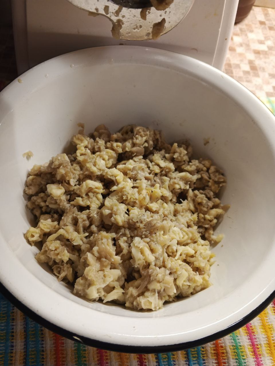 Вешенки пропукаем через мясорубку на средне-крупной решётке